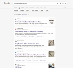 •  Low visibility on high-intent searches like “furniture store Oman,” “online furniture shopping Oman,” and “bedroom furniture Oman.”